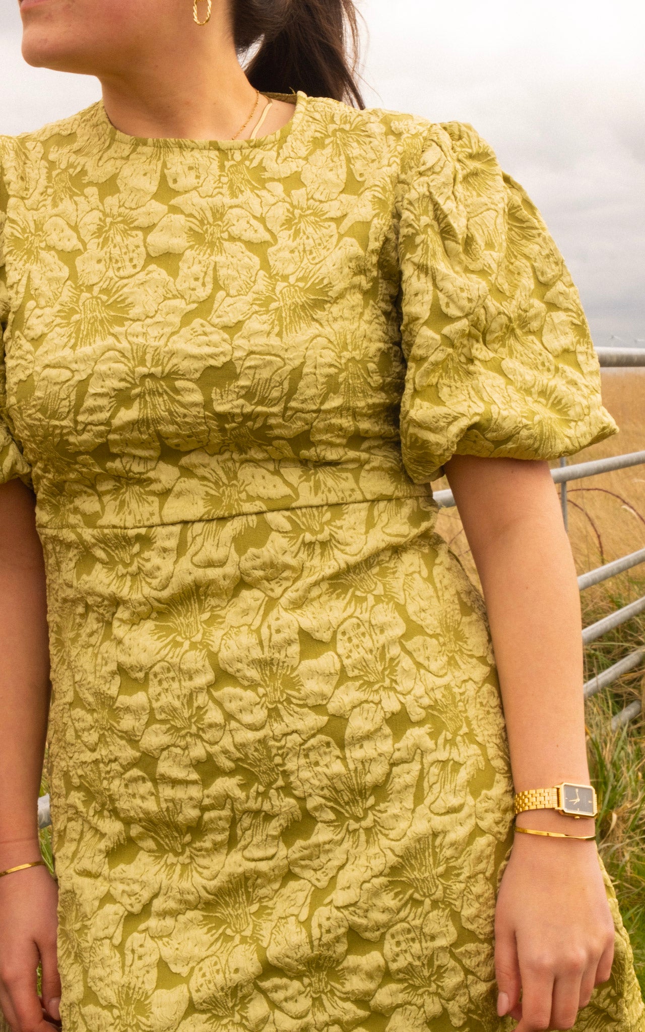 Getailleerd jurkje, ritssluiting aan achterkant. Noa draagt maat SM